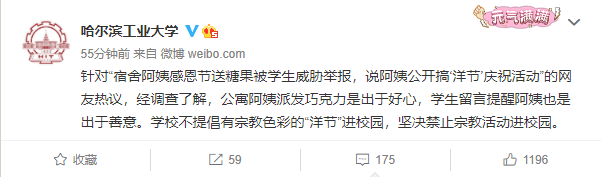 11月26日,有微博网友发帖称,哈尔滨工业大学宿管阿姨在西方“感恩节”向学生派发糖果,结果被一名学生留言威胁举报公开搞“洋节活动”。