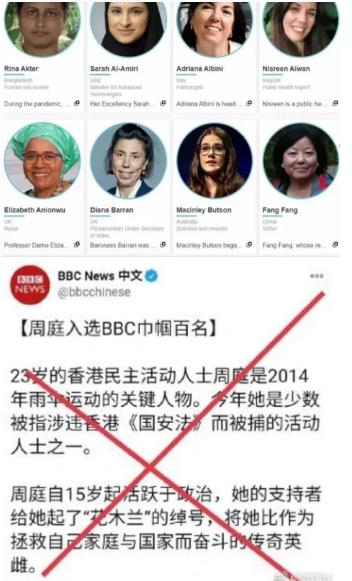 比如,11月23日,英国BBC公布了它评选的2020年度的100位女性名单,号称“百大巾帼”,其中有两位女性大家耳熟能详,一个是《武汉封城日记》作者、作家方方,另外一位是香港“废青领袖”周庭。