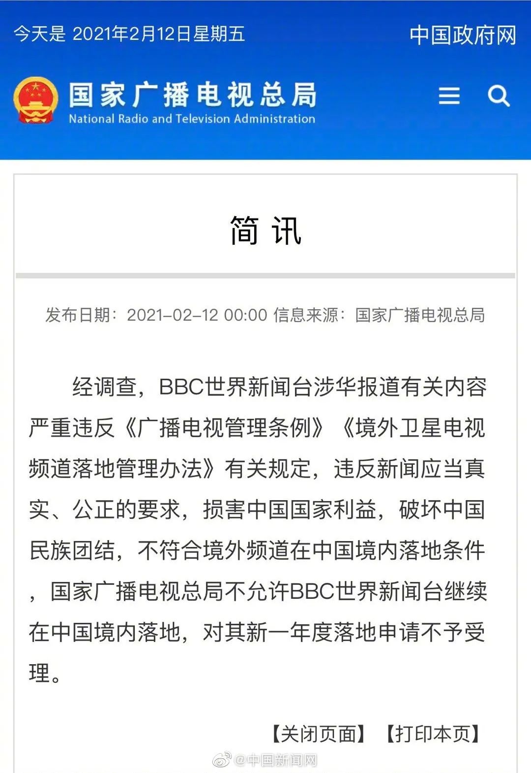 经调查,BBC世界新闻台涉华报道有关内容严重违反《广播电视管理条例》《境外卫星电视频道落地管理办法》有关规定,违反新闻应当真实、公正的要求,损害中国国家利益,破坏中国民族团结,不符合境外频道在中国境内落地条件,国家广播电视总局不允许BBC世界新闻台继续在中国境内落地,对其新一年度落地申请不予受理。