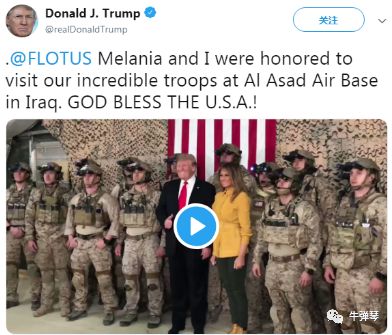 按照特朗普的说法,这次秘密之行很惊险,整个过程都是在黑暗中飞行,终于安全离开伊拉克后,兴奋的特朗普立刻在空军一号上发了一条推特,昭告天下: