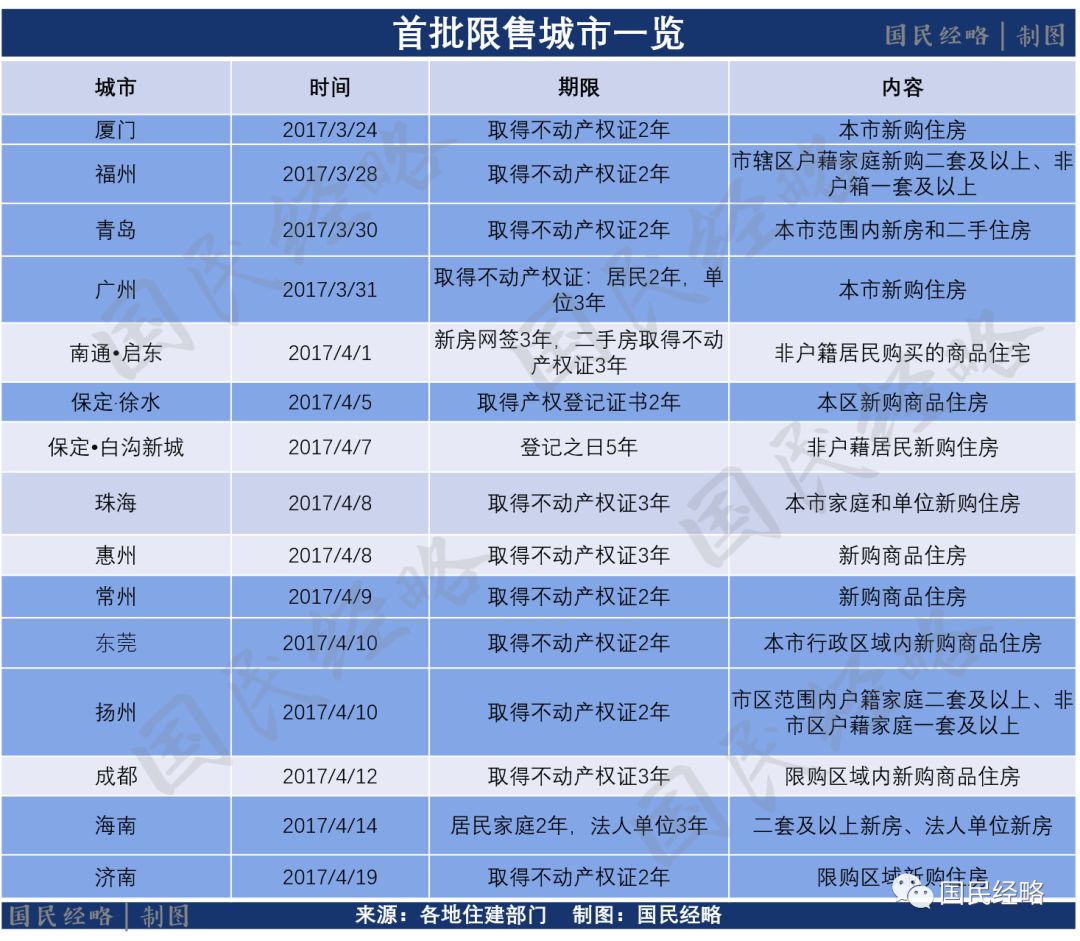 2017年3月24日,厦门率先出台“限售”政策,新购房一律获得不动产登记证2年后方可上市交易,限售由此开启。