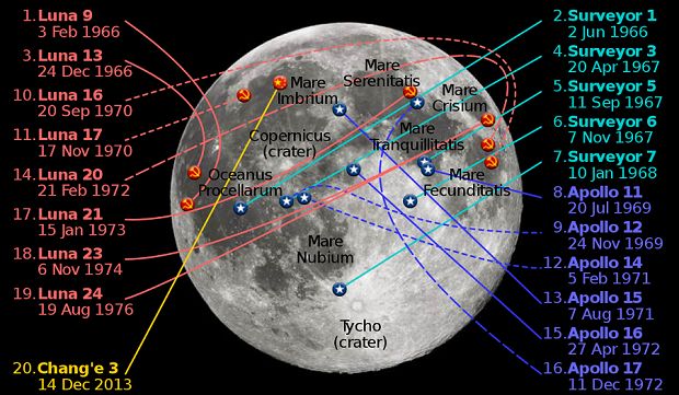 ▲ 在1966到1976年这短短的10年里,人类疯狂地把19台着陆器,3台月球车(包括阿波罗15的载人月球车),18个宇航员安全送上了月球表面。目前为止所有成功的月球软着陆任务,全部位于月球正面。