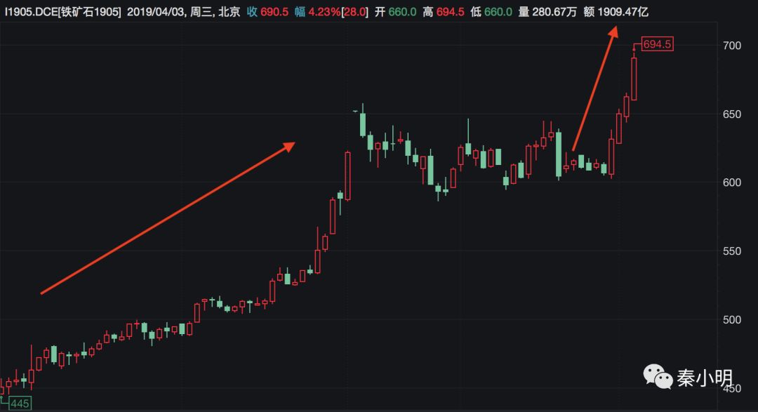 不讨论春节前的第一波猛烈拉升了。仅看这几天开始搞的第二波:从上周五3月29日起算,到今天收盘,短短四个交易日,铁矿石主力期货1905合约,从606元/吨涨至690.5元/吨,区间涨幅14%。