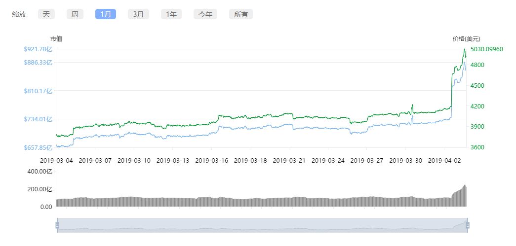 4月2日,比特币在1小时内瞬间突破4100美元左右,急速拉升到4800美元,随后多个平台报价直接突破5000美元,比特币奇迹般的涨了,涨幅高达30%左右。