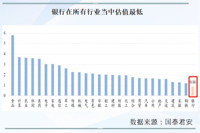 根据国泰君安的研究数据,截至到3月底,银行估值 PB(lf)在所有行业中最低,PB仅为0.86,32家上市银行当中有15家银行股价已经跌破每股净资产,同时也是从年初至今涨幅最低的板块,涨幅仅为16.8%。