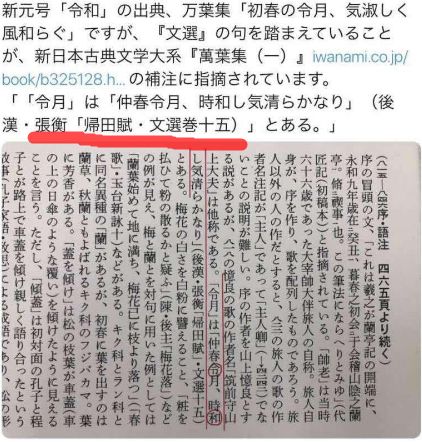 初春令月,气淑风和”一句在中国作品中有类似表达。汉代张衡所写的《归田赋》中有“于是仲春令月,时和气清”。该文收录于《昭明文选》。
