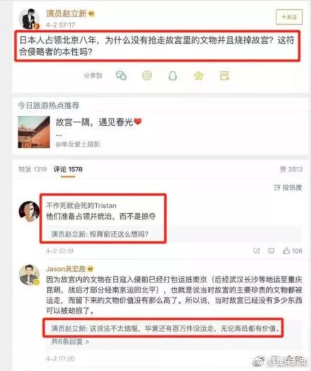 有网友提醒太说,因为故宫的文物在日寇入侵前就已经被搬运到了南京······结果赵立新回复说:这种说法不太信服,毕竟还有百万件没运走,无论高低都有价值。