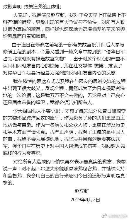 演员赵立新,在他昨天大火之前占豪就看过他的电视剧,因演技较好对他印象挺好,他演的电视剧《于无声处》与胡军飙戏一点不输。然而,4月2日他的言论引发舆论狂潮,结果第二天凌晨就不得不自打脸认错道歉的行为着实让人大跌眼镜,其言论让每一个正常的中国人都无法释怀,因为他在微博的言论被网友认为是在为日本侵华洗地。
