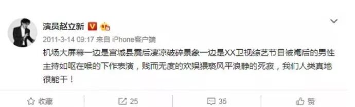 相比对自己祖国的不屑和调侃,他对瑞典和日本却情有独钟一样。有网友扒出他2011年的微博。2011年3月14日日本3·11大地震后,他在机场看到大屏幕上的综艺节目时竟发出如此微博。然而,问题在于,日本地震了中国凭啥停止综艺节目?日本自己都没停啊!人类世界灾难多了,一个国家有灾难自己国家举国哀悼很正常,但一国有灾难其它国家举国哀悼没有这个传统啊?全世界任何国家都没有,中国汶川地震的时候日本举国上下该怎么样就怎么样不是?