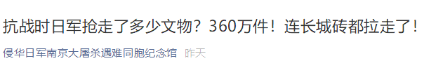 更何况,日本人真的没有抢走中国文物吗?事实并非如此!根据侵华日军南京大屠杀遇难同胞纪念馆官方微信披露的资料显示,抗战期间日军共抢走中国文物360万件,连长城的砖都拉走了!