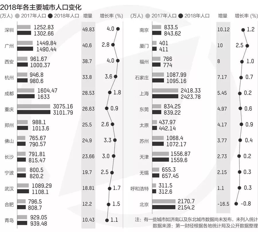 这两天第一财经对部分一二线城市2018年的人口数据进行了梳理,常住人口增加最快的十个城市分别是深圳、广州、西安、杭州、成都、重庆、郑州、佛山、长沙和宁波。总体上看,人口呈现由北向南流动的态势。