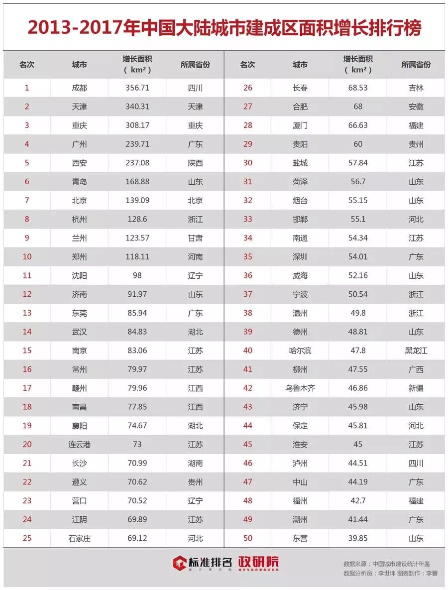 标准排名此前对内地城市建成区面积进行过梳理,近五年面积增长最快的十大城市,分别是成都、天津、重庆、广州、西安、青岛、北京、杭州、兰州、郑州,几乎全是一二线城市。