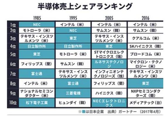从时间点上看,东芝事件可以说是日本半导体产业的转折点,到了1989年美国继续加码,迫使日本签订《日美半导体保障协定》,向美国开放日本半导体产业的知识产权、专利。从这以后,日本几乎没能在这个领域有所作为,再加上韩国、台湾的异军突起,日本半导体逐渐退出了历史舞台。
