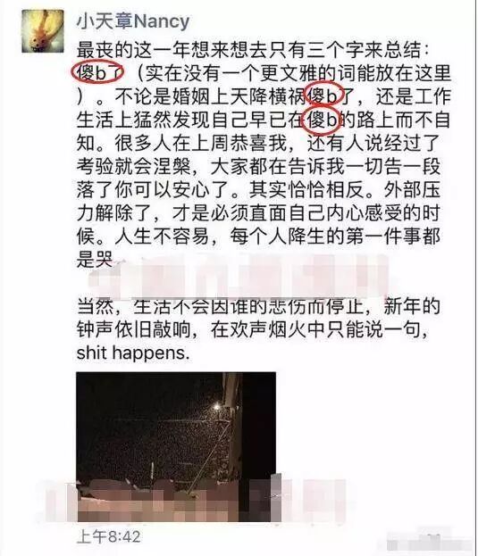 自明尼苏达事件之后,两人婚变传言就不绝于耳,先是两个人结婚时在澳大利亚购置的爱巢亏本甩卖,随后疑似章泽天的微信朋友圈流出,一连串的“傻b”昭示着内心的感受