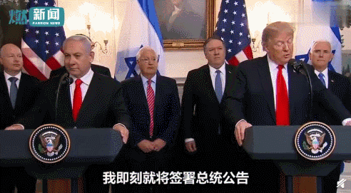 2019年3月25日,华盛顿白宫,在以色列总理内塔尼亚胡的见证下,美国总统特朗普签署了一份政府公告:美国正式承认,支持以色列对戈兰高地的主权。
