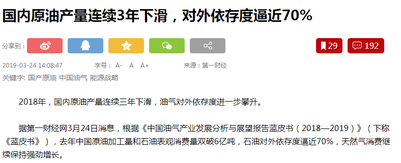 中国是目前世界上发展最快的国家之一,众多的人口和高速的社会经济发展,决定了中国未来对能源的需求将非常巨大。进入21世纪后,中国的能源安全面临着诸多新挑战。2018年,中国石油表观消费量达6.48亿吨,较上年增长6.95%;国内原油产量降至1.89亿吨,同比下降1.3%,石油对外依存度逼近70%!根据国际能源局的预测,“中国的能源需求到 2035年会占全球能源消费的三分之一。