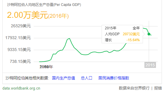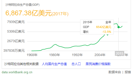 毫无疑问,这是“杀敌一千自损八百”的七伤拳,俄罗斯经济不好过,OPEC国家也好不到哪里去。以沙特为例,2013年GDP增速从12年的9.64%下跌到1.45%,国际油价最低的2015年,沙特GDP增速竟然是-13.5%。人均GDP也从2012年的25000美元,跌到2015年的20732美元。