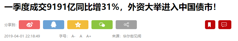 2019年以来,境外机构进入中国债市的规模大幅上升。一季度境外机构投资者新开户联网数量近300家,较2018年一季度翻两番,是2018年全年开户数的70%;一季度境外机构投资者累计成交9191亿元,较2018年一季度增长31%。