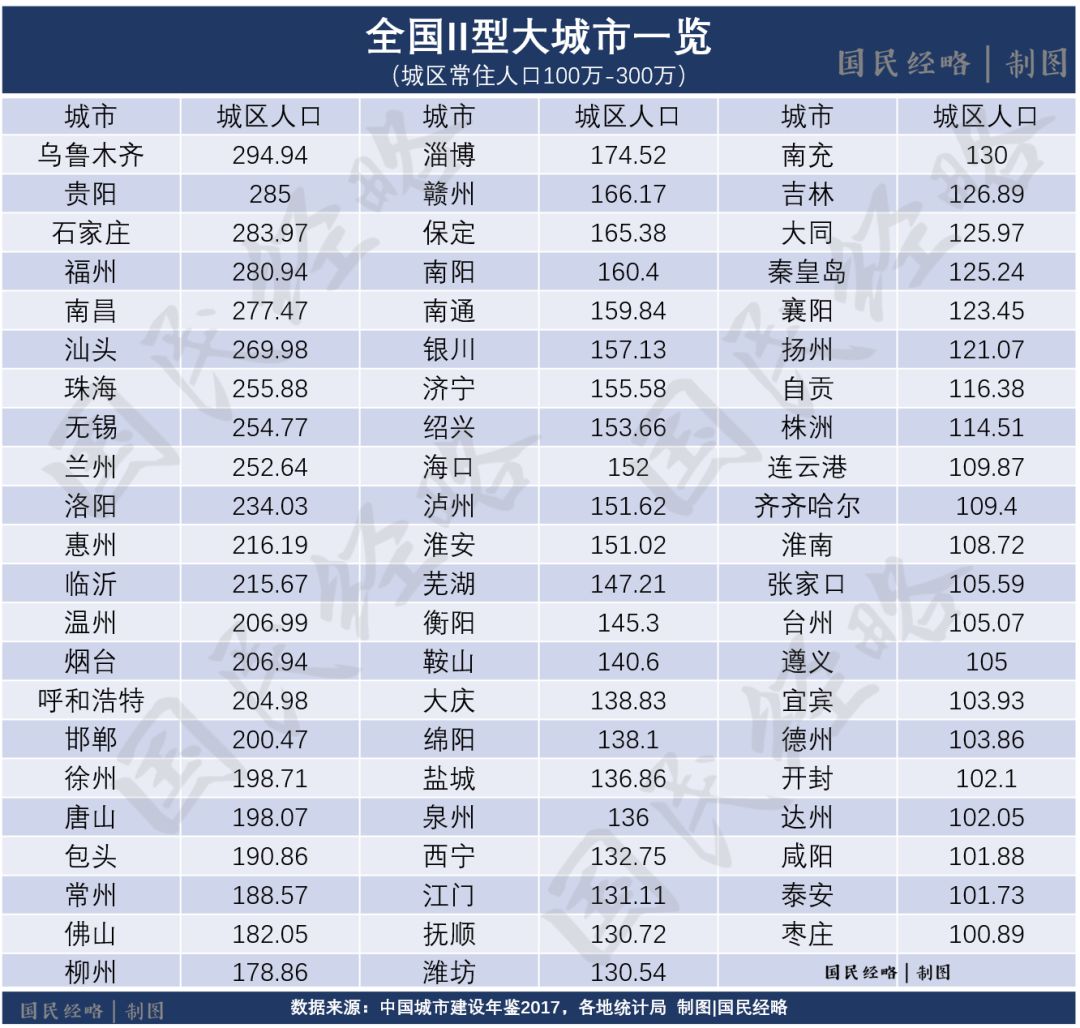 II型大城市(城区人口100万-300万):乌鲁木齐、贵阳、石家庄、福州、南昌、珠海、无锡、兰州、洛阳、惠州、温州、呼和浩特、唐山、佛山、海口等。