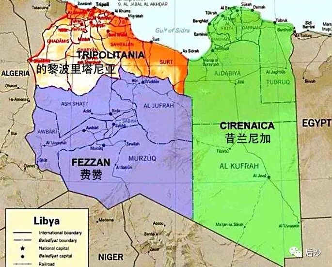 在近代史中,利比亚曾是意大利殖民地,它由昔兰尼加、的黎波里塔尼亚、费赞三个地区构成。