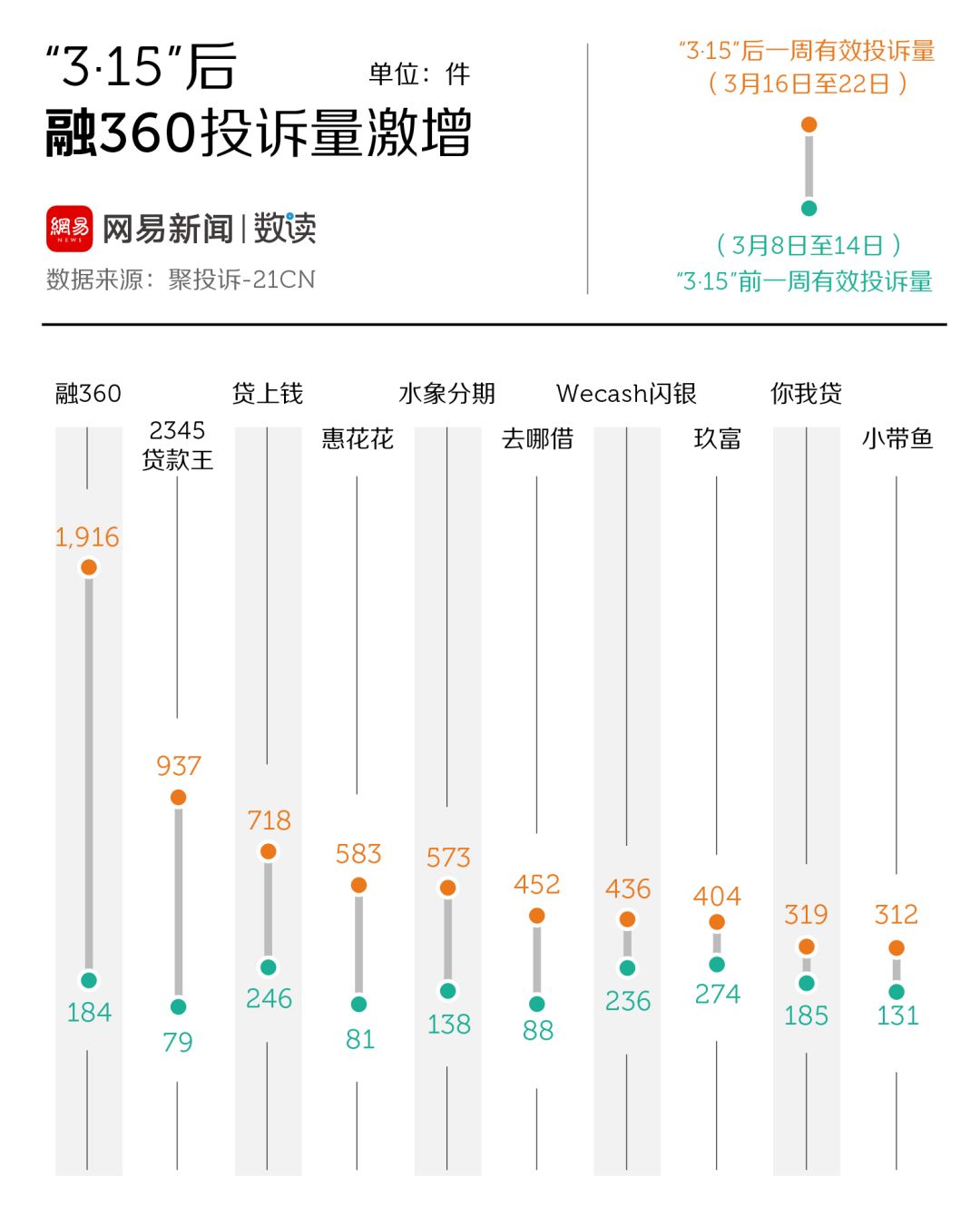 尤其是被央视点名的融360,“3·15”前一周的有效投诉量为184件,“3·15”后一周飙升至1916件,迅速登上投诉量排行榜榜首,遥遥领先其他商家。