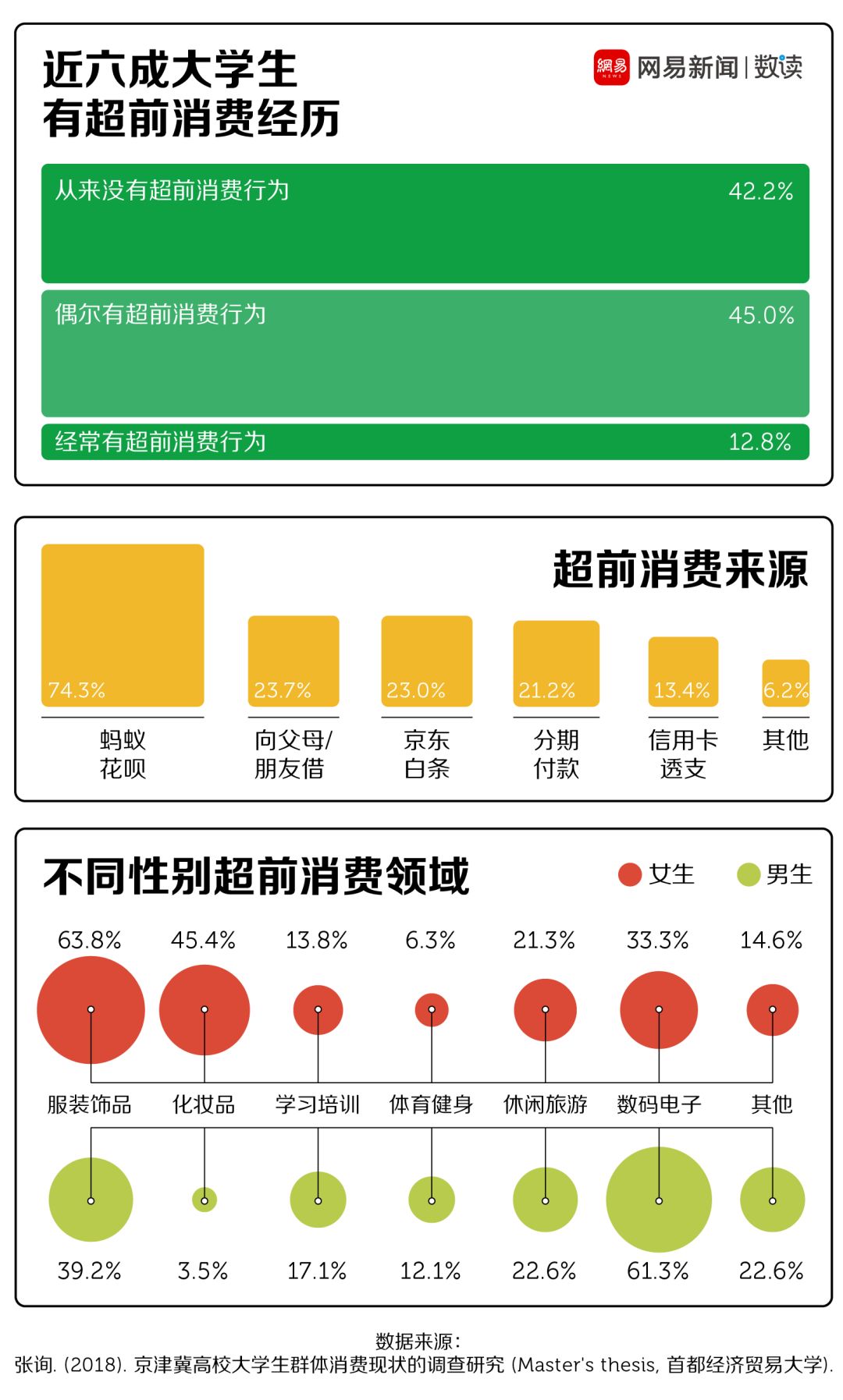 首都经济贸易大学的学者研究发现,京津翼地区近六成大学生有过超前消费经历,其中12.76%的大学生经常有超前消费行为,45%的大学生偶尔有超前消费行为。
