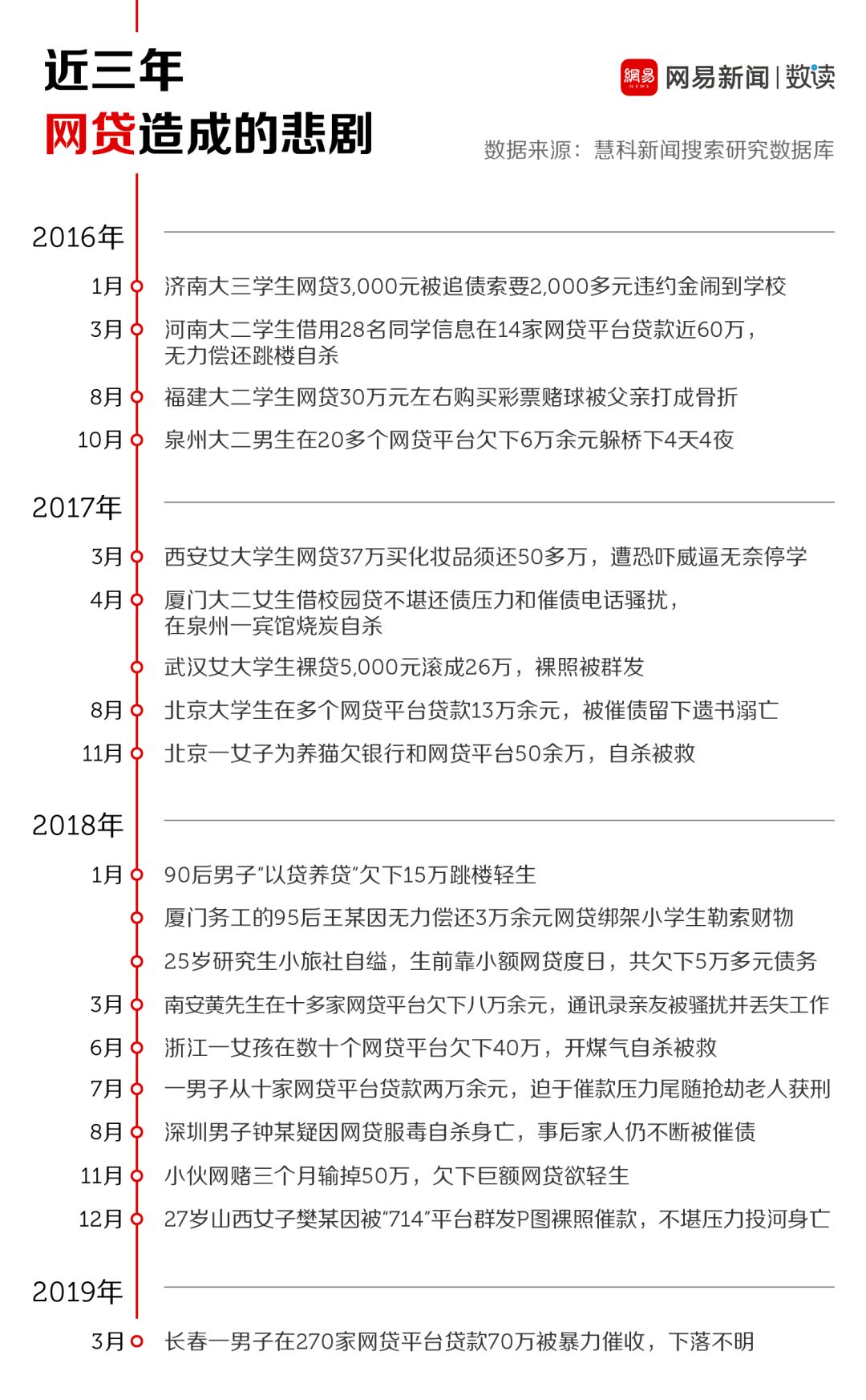 类似的新闻事件还有很多,通过梳理慧科新闻搜索研究数据库发现,近三年来网贷造成了多起悲剧,其中因暴力催收和无力还贷而选择结束生命的例子不在少数。