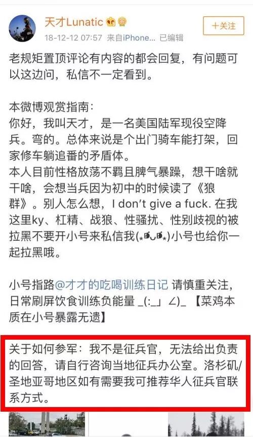 而在去年的微博上,她又不余遗力的推荐华人征兵官的联系方式。