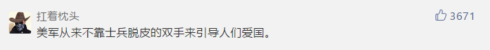而在这篇文章的留言里,还有人阴阳怪气的讽刺道:美军从来不靠士兵脱皮的双手来引导人们爱国。注意点赞数:3671,看来不少中国人“人在曹营心在汉”啊。