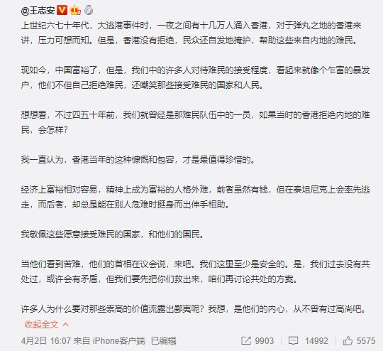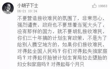 而知名博主又说,不过四五十年前,我们就是难民,逃到香港的难民。但现在,我国对待难民的态度就像个暴发户,自己拒绝难民,还嘲笑那些接受难民的国家和人民。