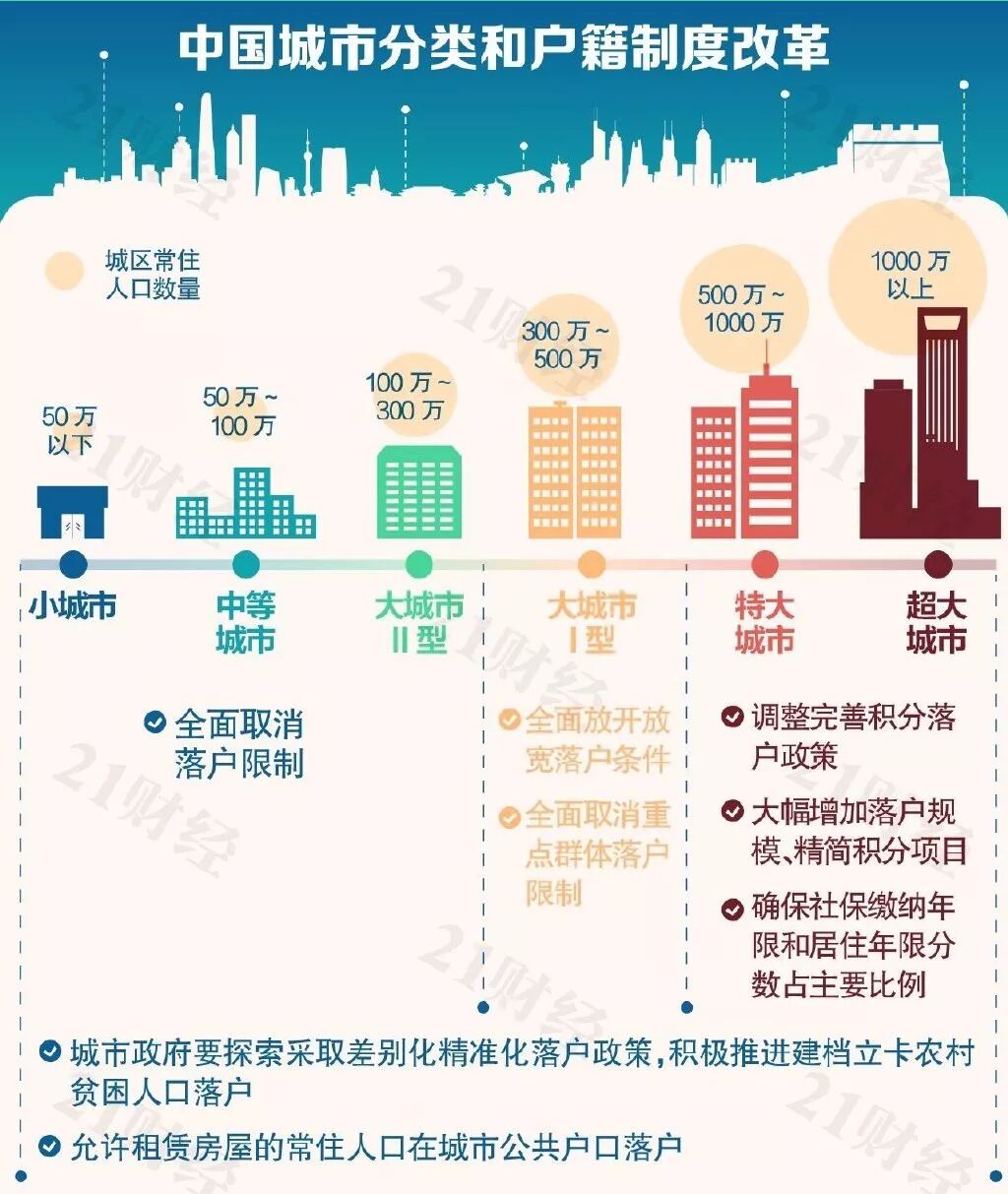 在此前城区常住人口 100 万以下的中小城市和小城镇已陆续取消落户限制的基础上,城区常住人口 100 万—300万的Ⅱ型大城市要全面取消落户限制;城区常住人口 300 万—500万的Ⅰ型大城市要全面放开放宽落户条件,并全面取消重点群体落户限制。