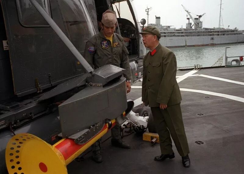 在圣迭戈海军基地,刘华清先后参观了CV-63小鹰号和CV-61突击者号航空母舰。这是中华人民共和国高级军事将领首次登上美国航空母舰。在突击者航母上,刘华清留下了这张著名的照片: