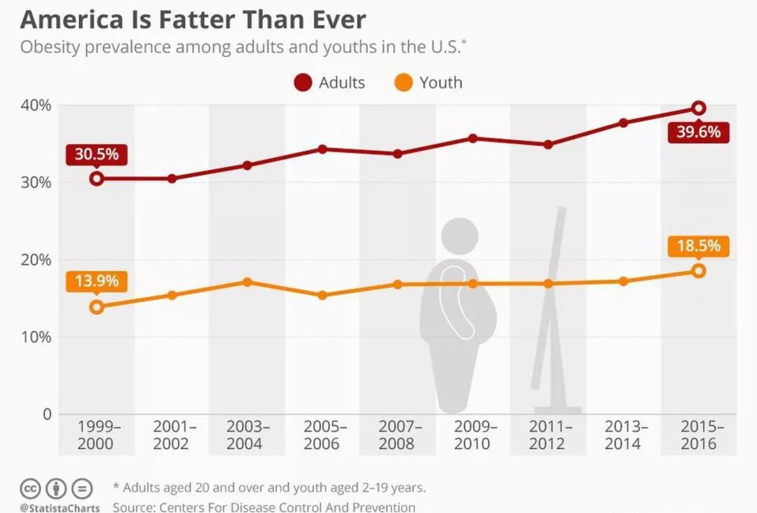 (美国人肥胖率:红色为成年人,橙色为年轻人)