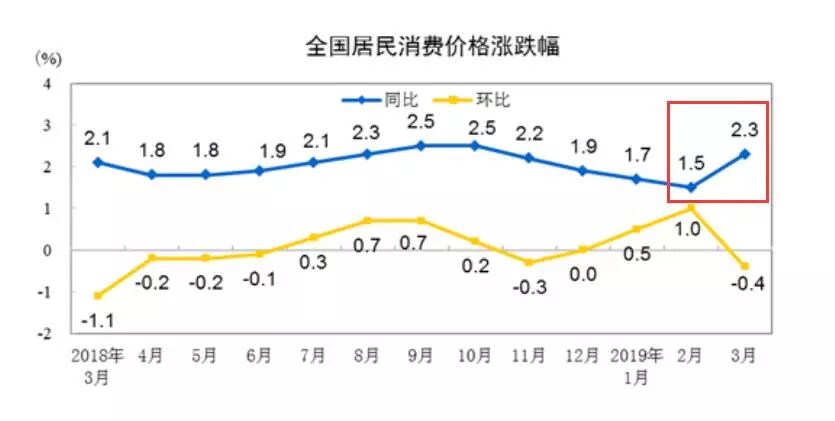 上图是CPI走势,请注意红框里的蓝线。CPI(居民消费价格指数)的同比涨幅,一下子从1.5%跃升到了2.3%。这好比天气一夜由寒冬进入了初夏。