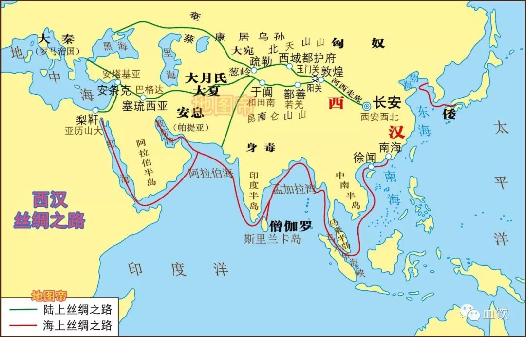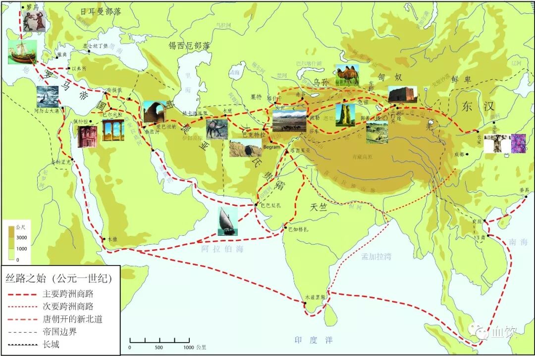 上面两图可以看出,汉唐丝绸之路终点在现在的意大利。