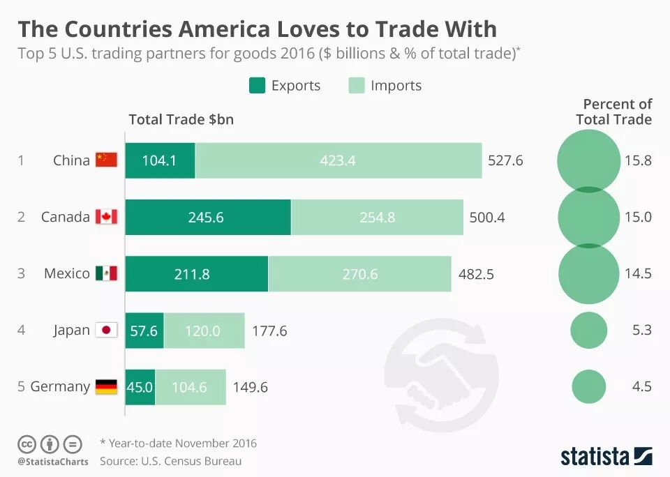 2016年美国最重要的贸易伙伴排名