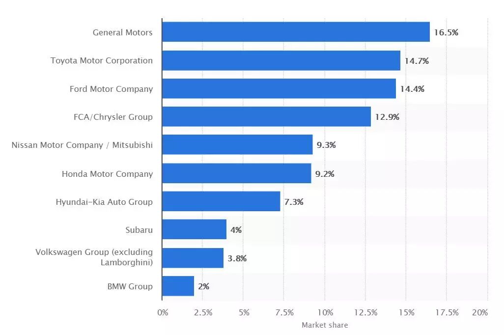 2018年,主要品牌汽车在美国的市场份额