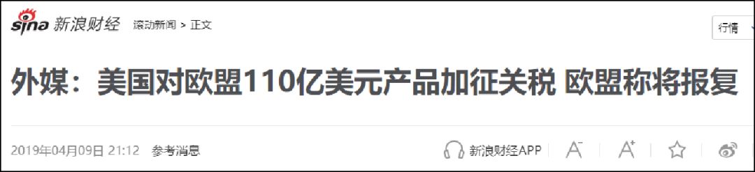 特朗普在推特上发文称:“世贸组织发现,欧盟对空中客车的补贴对美国产生了不利影响,美国现在将对110亿美元的欧盟产品征收关税。多年来,欧盟一直在贸易方面利用美国。这很快就会停止!”