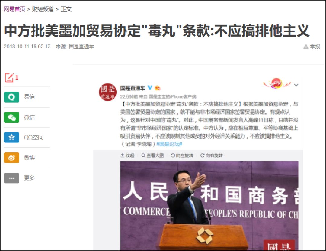 美国非但逼迫加拿大和墨西哥投降了,而且在修改版的《北美自由贸易协定》中间加入了一条针对中国的“毒丸”条款:根据美墨加贸易协定,与美国签署贸易协定的国家,就不能与非市场经济国家签署贸易协定。