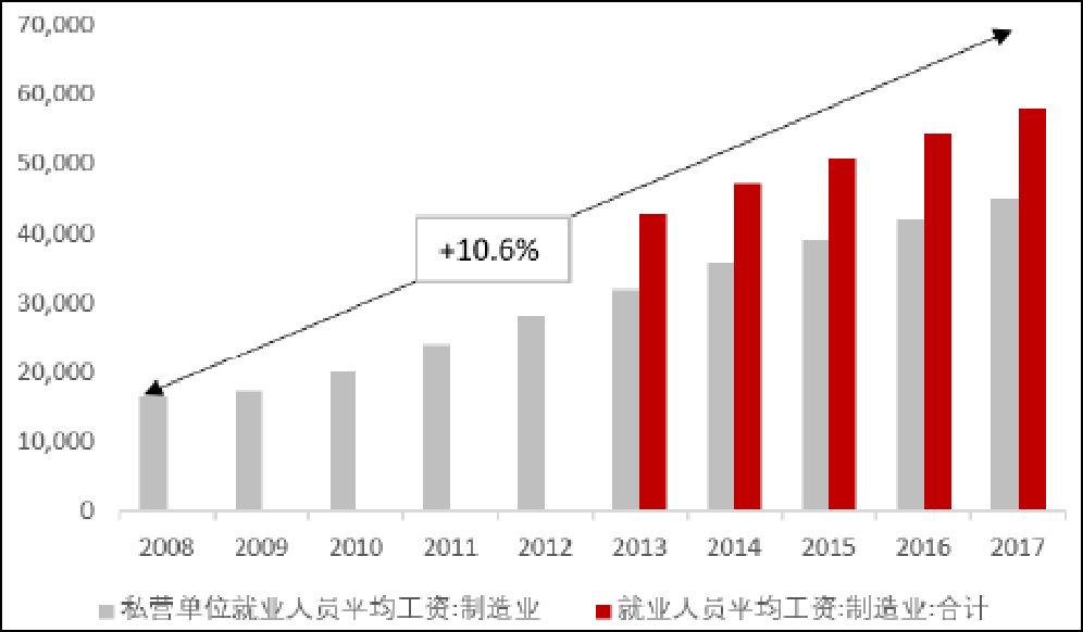 2017年中国制造业平均工资为6.2万,3倍就是大概18万,折算成美元就是3万美元左右。