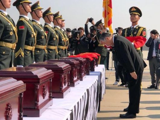 2019年4月3日上午11:36分,在两架歼-11战机的护航下,搭载着10具中国人民志愿军烈士遗骸的专机,降落在沈阳桃仙国际机场。