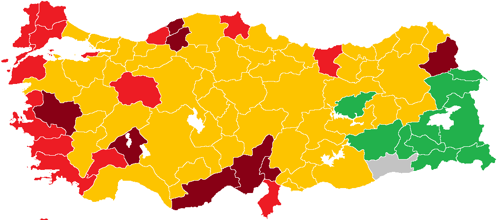 土耳其81大省中,总统埃尔多安所领导的正义与发展党(AKP)虽仍维持多数统治,但只拿到39省的执政权,比起2014年的53省少了许多;更被共和人民党(CHP)连下三城,拿到了前三大省的执政权:伊斯坦布尔、安卡拉与伊兹密尔。