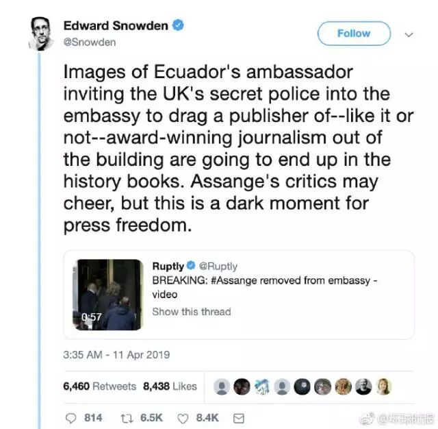 “斯诺登今天也发推声援阿桑奇,控诉美国所谓新闻自由了。”