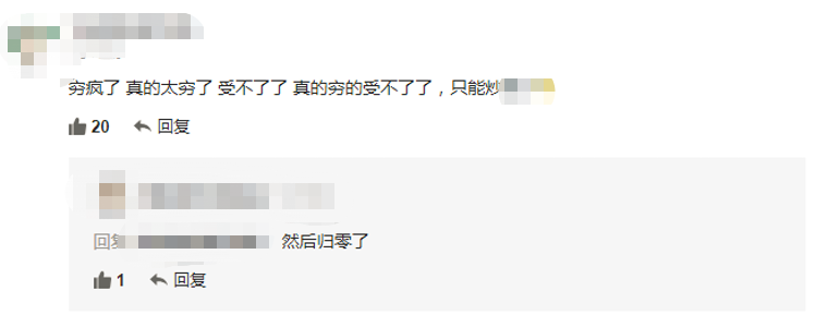 有位年轻朋友这样留言:“穷疯了,真的太穷了,受不了了,真的穷的受不了了,只能疯狂的炒了。”
