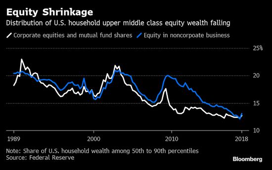 中上层阶级的公司所有权——包括上市公司和私人公司的股权——也在一直下滑。净资产排名在50百分位到90百分位之间的美国家庭拥有的股权比例有所下降。最富有的1%的美国人拥有大部分的股票。