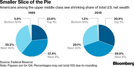 截至2018年底,美国中上层阶级的净资产占美国总资产的比例大幅下降。在一代人的时间里,净资产排名在50百分位到90百分位之间的美国家庭的财富占总财富的比例从35.2%下降到29.1%。大部分的财富都转移到了美国最富有的1%的家庭。(张宁)
