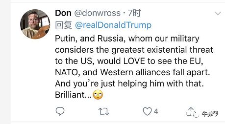 普京和俄罗斯,才是我们美国最大的外部威胁,他们很高兴看到欧盟、每月和西方联盟分崩离析,你现在却在帮助他实现这一点,太棒了……