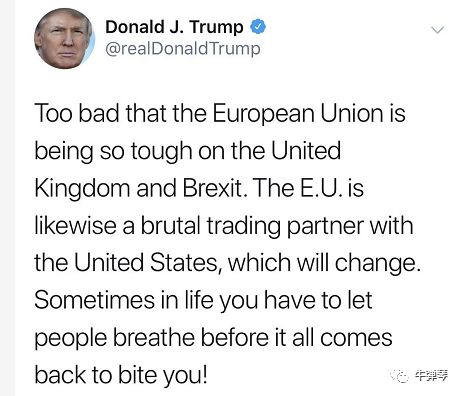 特朗普就这么劝架了:一边是好朋友英国,另一边是好朋友法国德国,但特朗普毫不犹豫地痛骂欧盟欺人太甚。