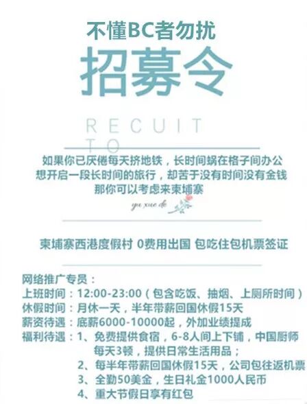 当然了,有一些菜农对于高薪暴富有迷之自信,如同传销的套路,自己都深陷泥潭了却到处画饼。在西哈努克做报道时我刚接触博彩业,就在某博彩基地遇到了一位这样的人事小主管。