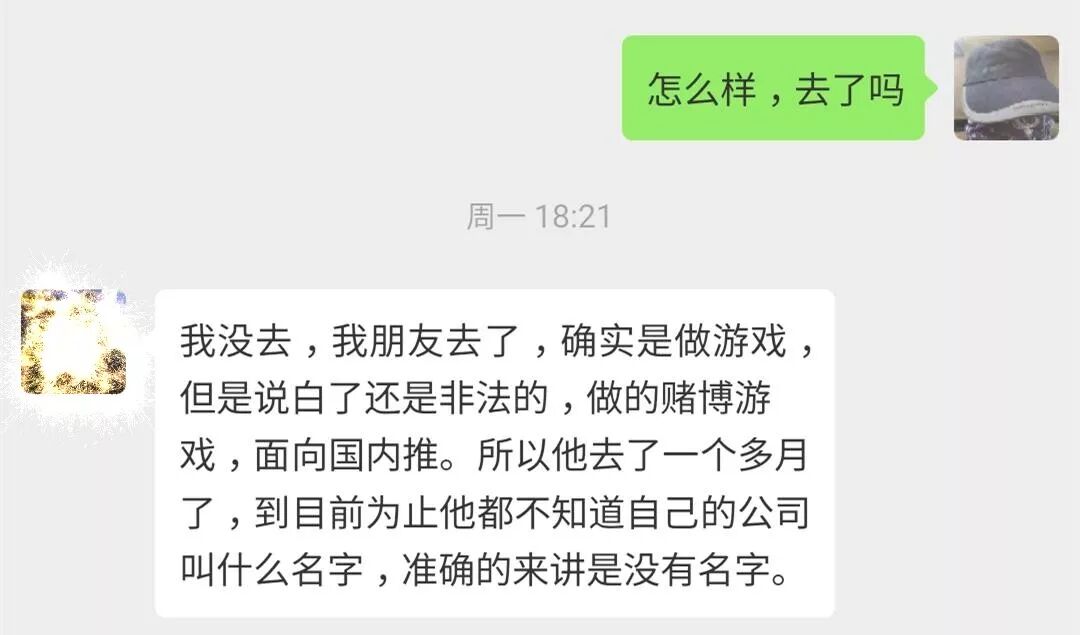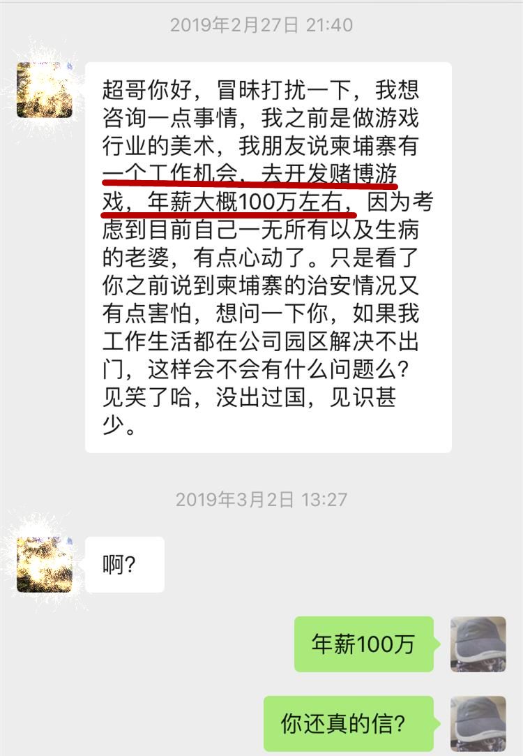 前段时间我的一个读者就遇到了这样的“好事”,他在微信上找我:“超哥,朋友说柬埔寨有个机会,开发赌博游戏,年薪给我100万,我有点心动了。”
